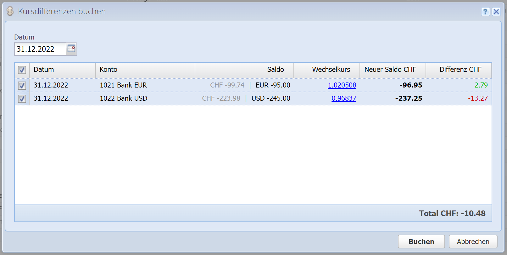 Die Beträge, welche schließlich im Journal gebucht werden, sind in der letzten Spalte "Differenz CHF" (angenommen, Ihre Hauptwährung ist CHF) zu sehen. Damit verändert sich nur der Saldo in der Hauptwährung, der Fremdwährungssaldo bleibt gleich.