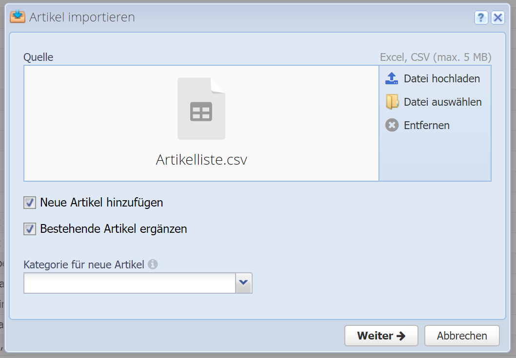 Damit setzen Sie die Kategorie für alle neuen zu importierenden Artikel. Kategorien aus der Datei werden dabei ignoriert. Kategorien von bereits bestehenden Artikeln werden nicht verändert.