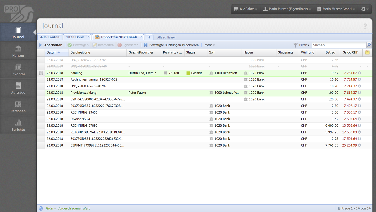 Text eines Feldes grün = Durch CashCtrl vorgeschlagener Wert (CashCtrl lernt mit jedem Import dazu).