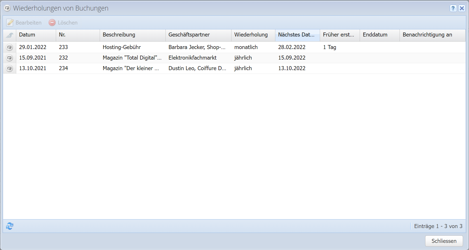 Hier können Sie alle sich wiederholenden Buchungen einsehen und die Wiederholungen bearbeiten oder löschen. Die entsprechende Buchung kann hier allerdings nicht bearbeitet werden, nur die Wiederholungs-Attribute.