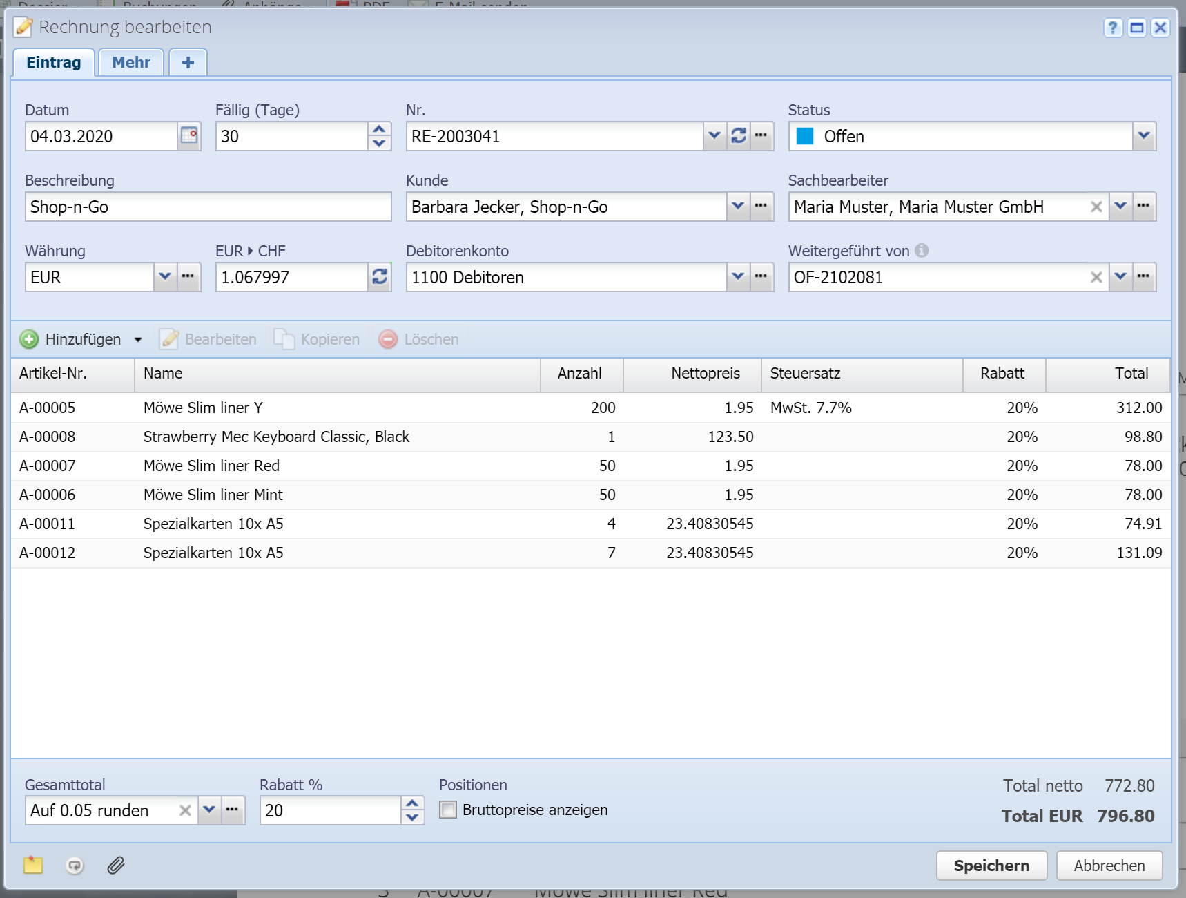 Man kann einen Rabatt auf das Gesamttotal setzen, in Prozent. Hiermit wird im Prinzip ein Rabatt auf jede Position gesetzt. Der Rabatt kann allerdings in den einzelnen Positionen überschrieben oder auf 0 zurückgesetzt werden.
