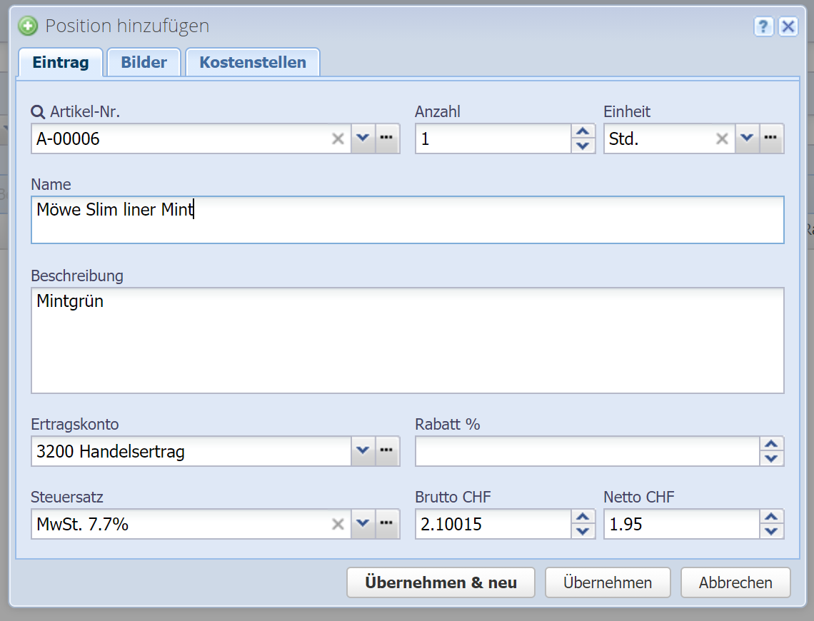 Wird ein Artikel ausgewählt, werden die meisten Felder der Position automatisch befüllt (sofern die Informationen beim Artikel vorhanden sind). Ansonsten können Sie alle Felder auch manuell eingeben.