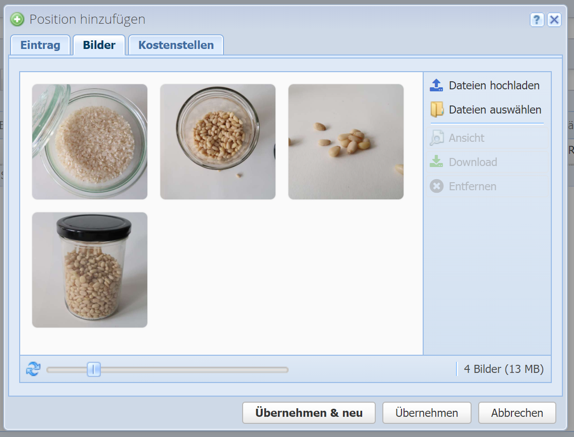 Hier können Sie ein oder mehrere Bilder zur Position hinzufügen, welche auf dem PDF-Dokument dargestellt werden können, indem ein geeignetes Layout ("mit Artikel-Bild") gewählt wird. Bilder, welche beim Artikel bereits hinterlegt sind, werden hier automatisch übernommen, können aber angepasst werden.