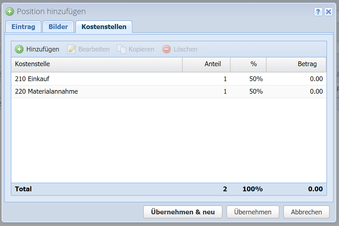 Der Betrag kann (in der Hauptwährung, ohne MwSt.) auf Kostenstellen verteilt werden. Sie können mehrere Kostenstellen eingeben und den jeweiligen Anteil am Betrag (z.B. 1:1, was 50%:50% entspricht). Tipp: Der Prozentwert wird automatisch vom Anteil berechnet, aber als Anteil können Sie auch einfach den Prozentwert eingeben, das kommt aufs Gleiche.