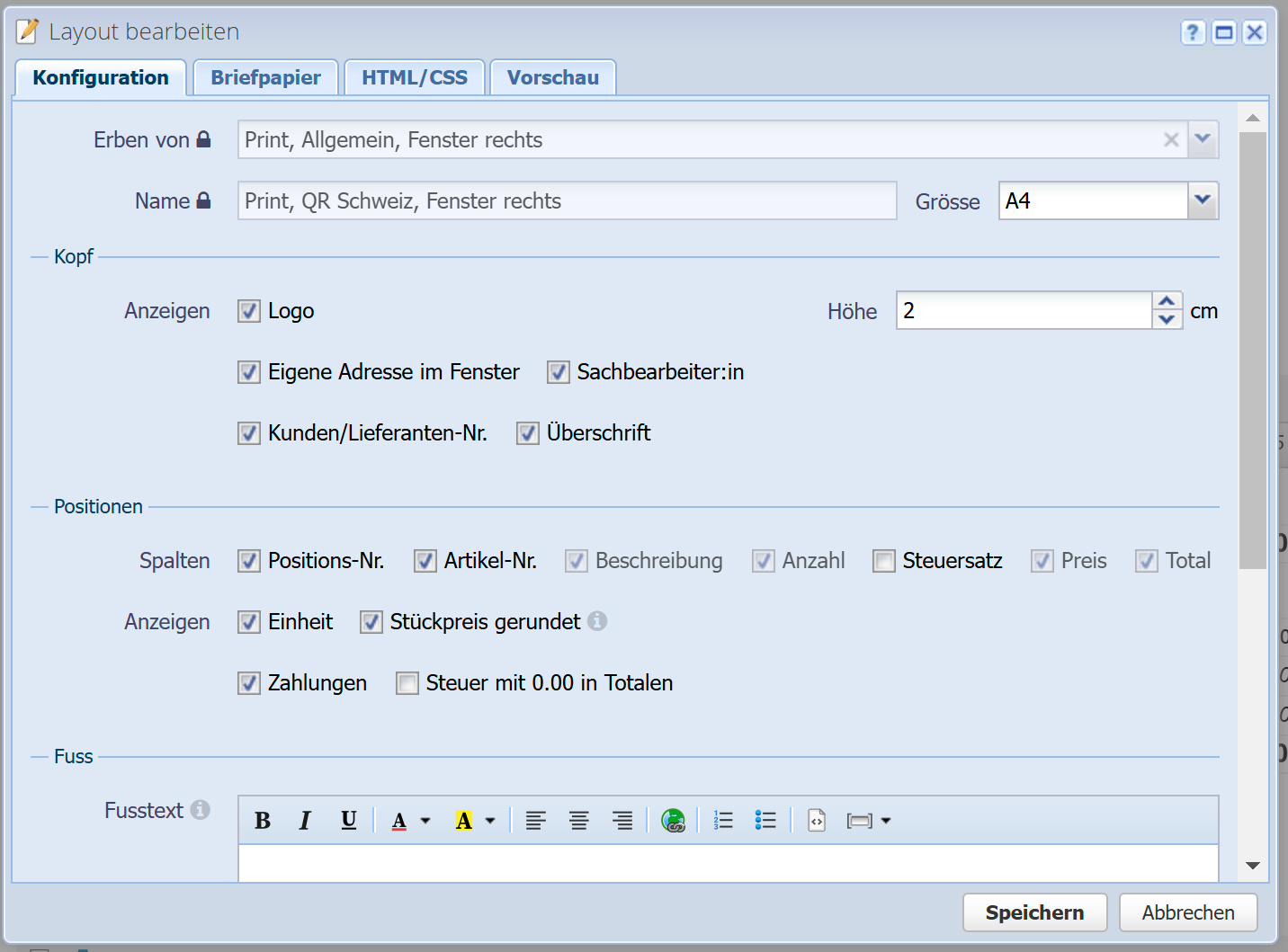 Hier können Sie Elemente im Fussbereich des Dokuments ein- / ausblenden und den Fusstext eingeben.
