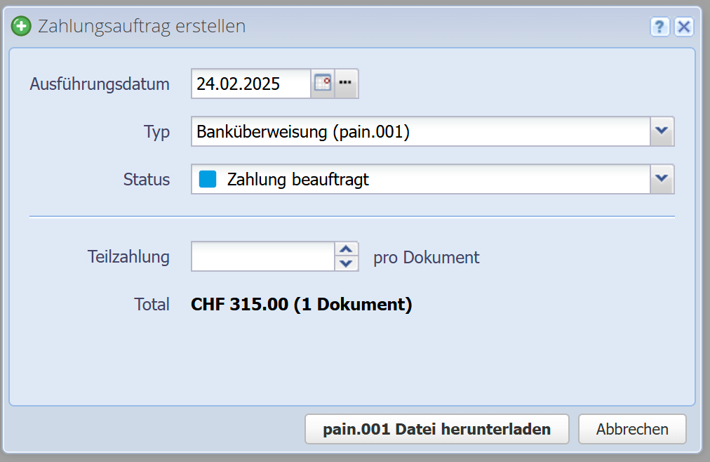 Je nach Auswahl wird eine pain.001-Datei (XML) oder ein PDF mit den Zahlungsdetails erstellt.