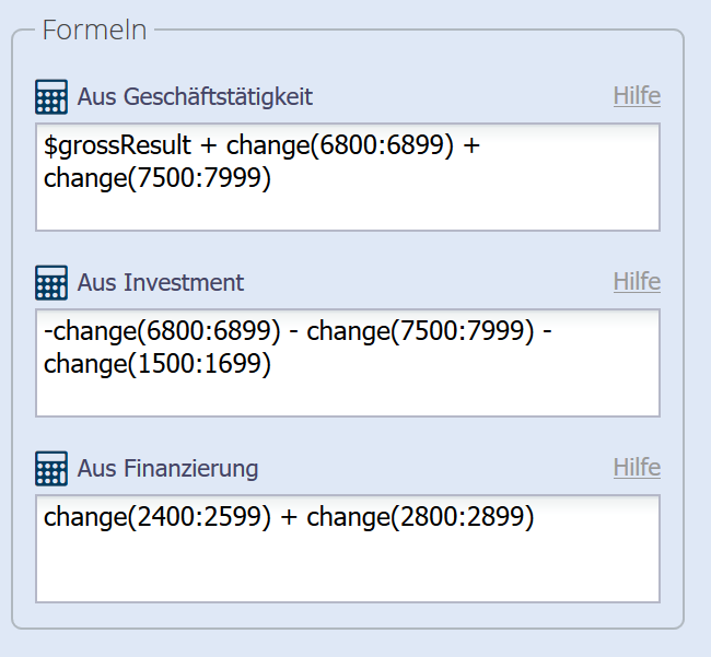 Die drei Teile der Mittelflussrechnung (Cashflow aus Geschäftstätigkeit, aus Investment, aus Finanzierung) werden jeweils mit Formeln berechnet. Dabei können Sie mathematische Operatoren, Variablen und Funktionen verwenden.