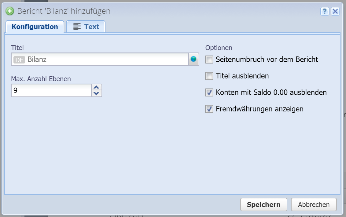 Alle weiteren Felder (wie "Max. Anzahl Ebenen" etc.) sind bericht-spezifisch und werden in dieser Dokumentation nicht beschrieben, bis auf ein paar komplexere Berichte wie z.B. der Cashflow, siehe Unterthemen.