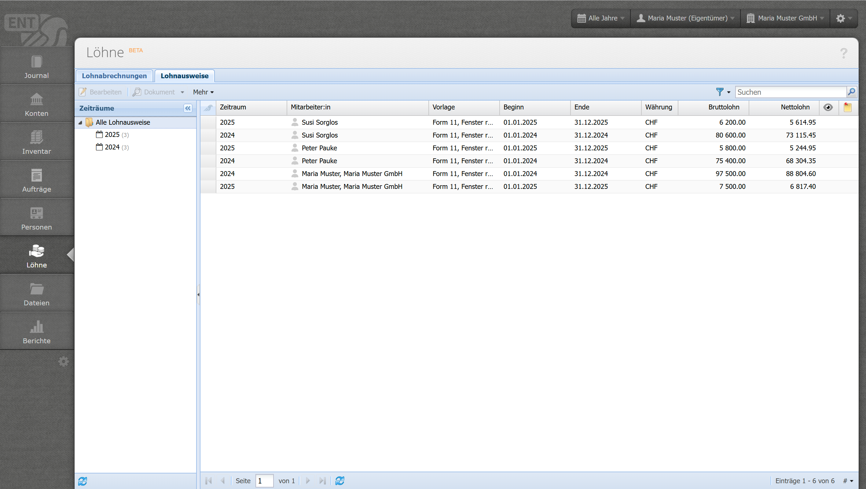 Hier befinden sich die Lohnausweise (Formular für die Steuerbehörde) aller Mitarbeiter. Diese werden automatisch aus Lohnabrechnungen generiert, und können nicht manuell erstellt werden. Dabei werden Lohnabrechnungen im Entwurf ignoriert. Die Lohnausweisvorlagen können unter Lohnkonfiguration / Lohnausweise bearbeitet werden (auf eigene Gefahr).