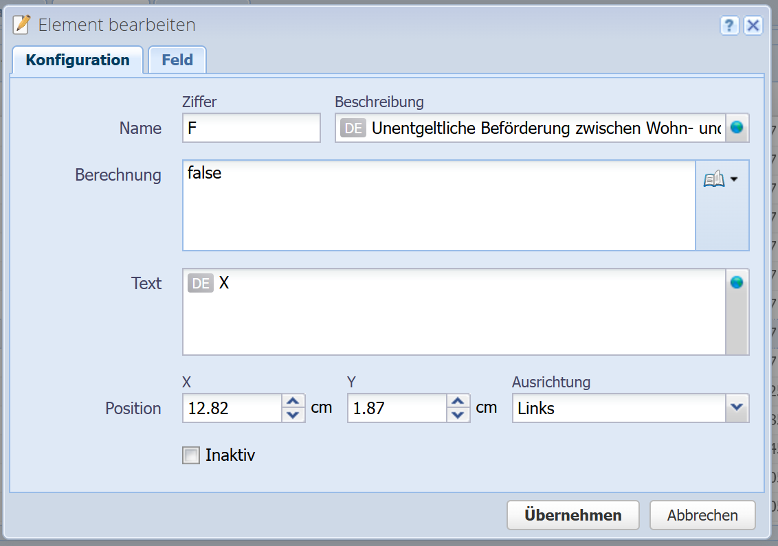 Ob dieses Element durch ein dynamisches Feld überschrieben werden kann. Für die meisten Elemente, welche durch Lohnarten berechnet werden, ist dies nicht nötig. Dies ist nur für diverse Texte und Checkboxen sinnvoll, die zusätzlich zu den berechneten Beträgen auf das Formular gedruckt werden.