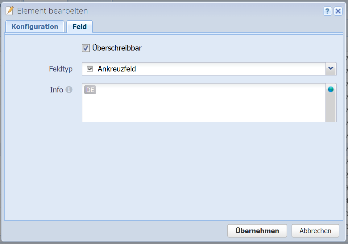 Der Text, den Sie hier eingeben, wird beim Feld als Tooltip über einem Info-Symbol dargestellt (bei Mouseover). Dieser Text kann mehrsprachig eingegeben werden, siehe Übersetzungsfeld.