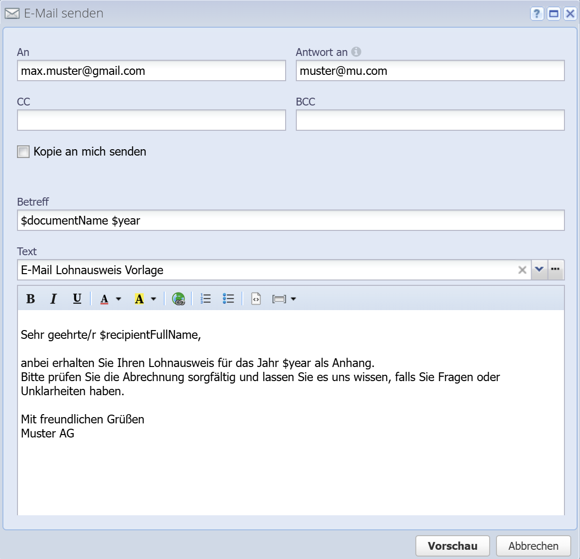 Wichtig: Bevor die E-Mail versandt wird, wird eine Vorschau angezeigt, wie die E-Mail effektiv aussehen wird. Falls Sie Platzhalter verwendet haben, bitte überprüfen Sie zuerst ob die korrekten Informationen dargestellt werden.