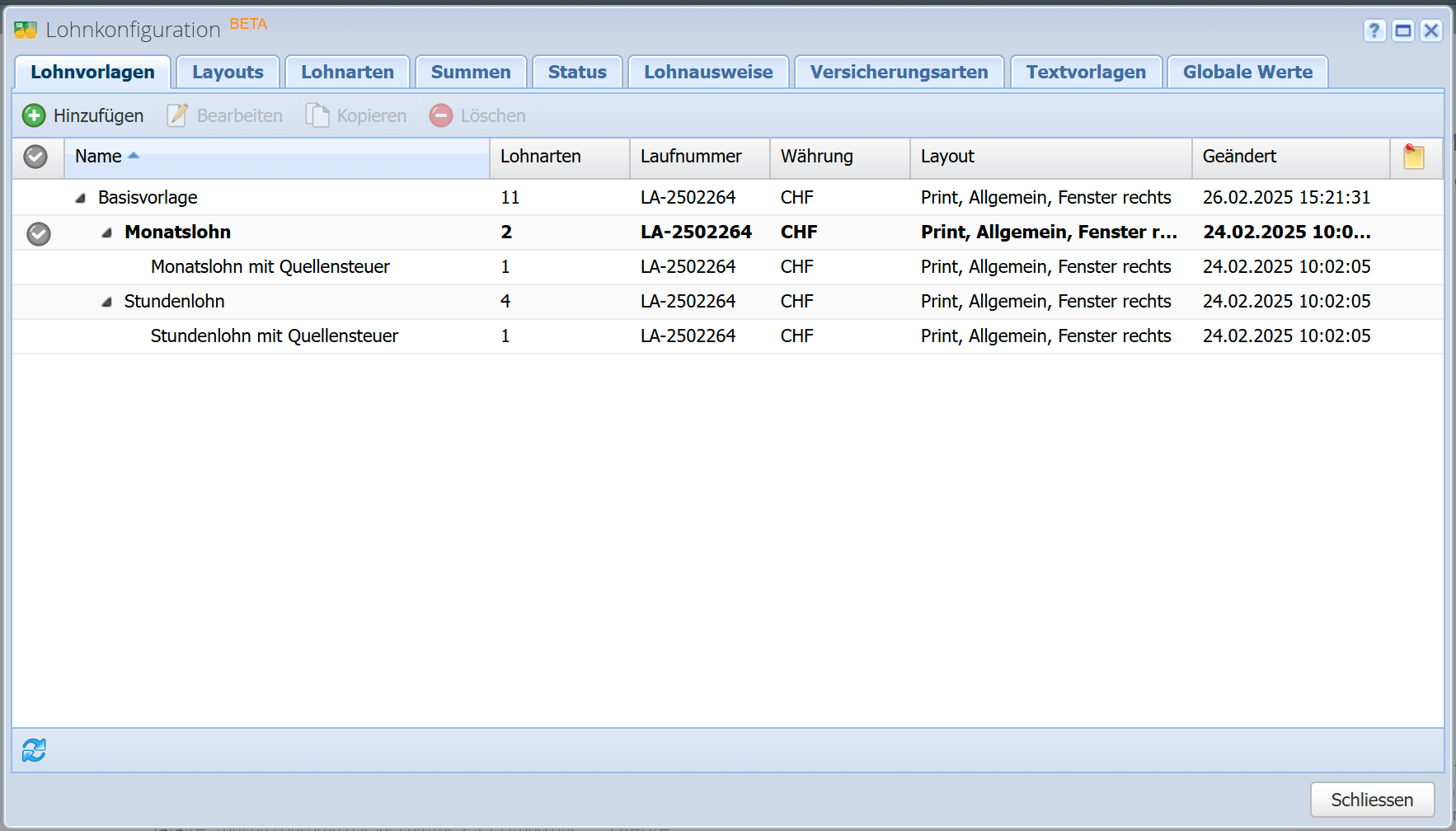 Hier verwalten Sie die Layouts der Lohnabrechnungen, d.h. das Design des PDFs. In den Lohnvorlagen setzt man dann jeweils das Layout, welches die Lohnabrechnungen übernehmen.