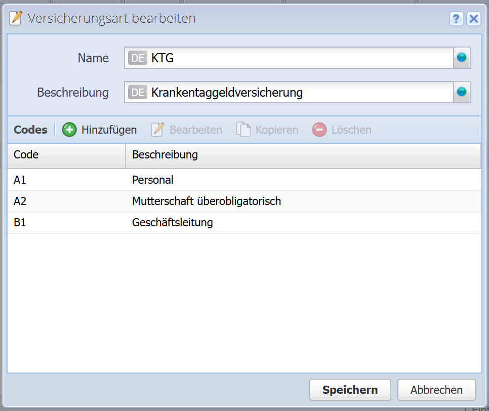 Optional mehrere Codes (jeweils Code und Beschreibung), die die Versicherungsart definiert. Sind keine Codes definiert, kann für diese Versicherungsart nur eine Versicherung auf der Lohnabrechnung / Lohnvorlage gesetzt werden. Sind Codes definiert, kann pro Code eine Versicherung gesetzt werden.
