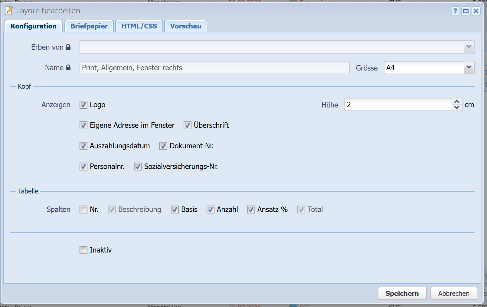 Hier können Sie Elemente im Kopfbereich des Dokuments ein- / ausblenden, und die Grösse des Logos (Höhe in Zentimeter) angeben.