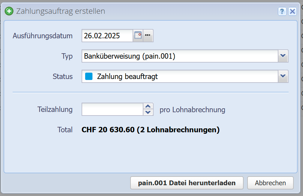 Standardmässig wird der vollständig offene Betrag der Lohnabrechnung(en) bezahlt. Geben Sie hier einen Betrag ein, falls Sie eine Teilzahlung vornehmen möchten. Dieser Betrag gilt pro Lohnabrechnung.