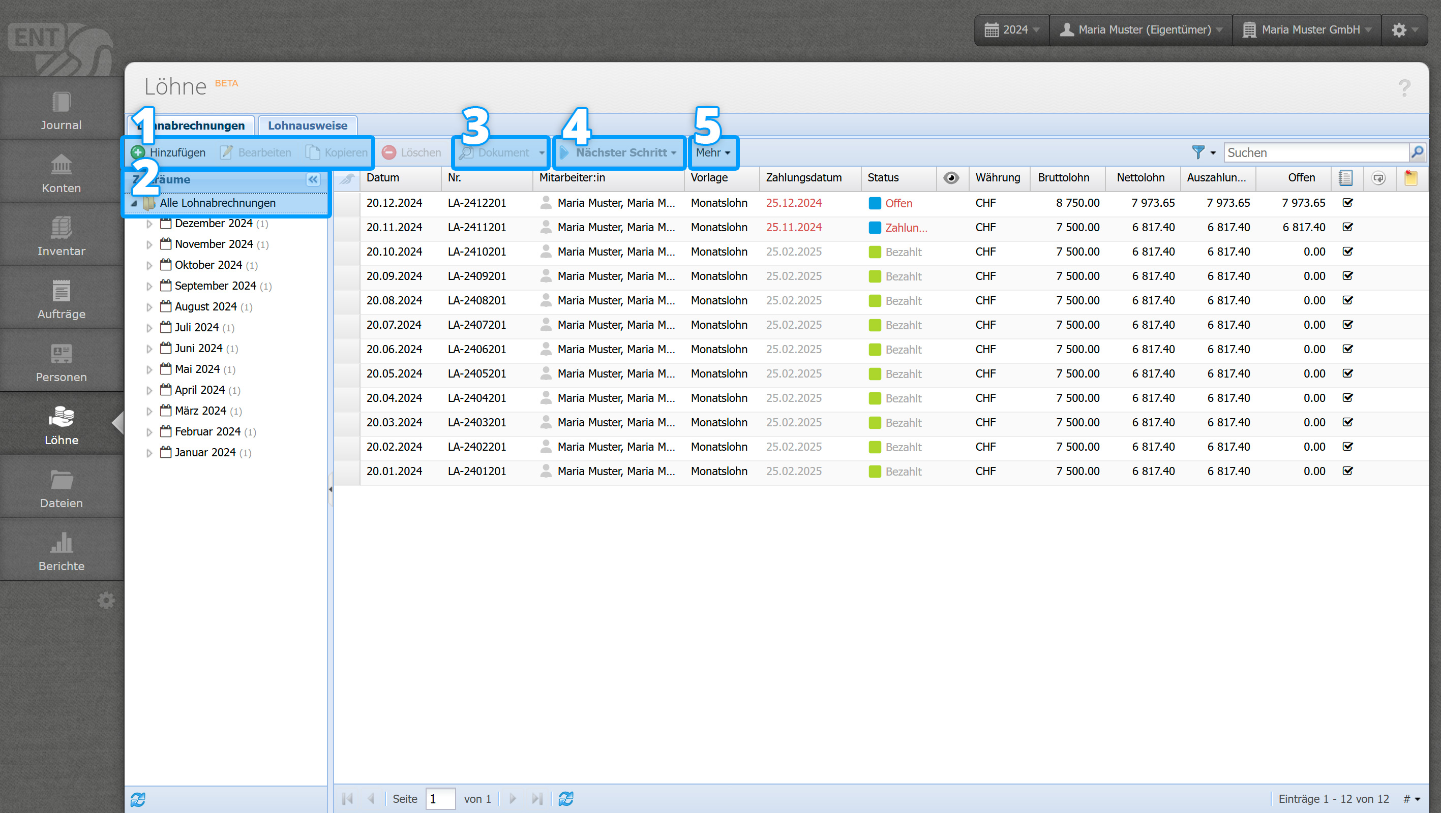 Die Lohnabrechnungen in der Übersicht lassen sich hier nach Monaten und Status filtern. Dargestellt werden dabei nur die Lohnabrechnungen in der aktuell gewählten Lohnperiode (siehe Rechnungsperiode). - Dokument [mehr]