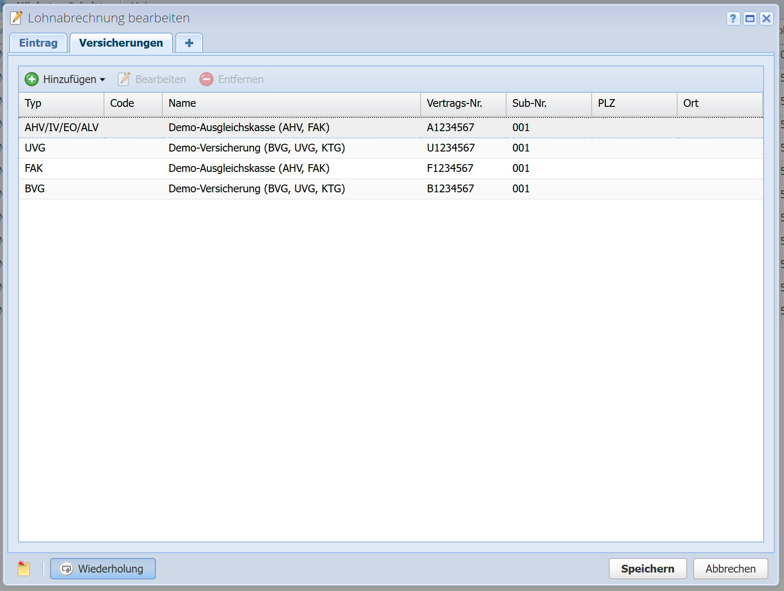 Bietet eine Versicherung z.B. BVG und UVG an (2 Verträge), dann kann diese Versicherung bei der Lohnabrechnung zweimal hinzugefügt werden, einmal für BVG und einmal für UVG. Gibt es bei einer Versicherungsart unterschiedliche Codes, wie z.B. bei KTG die Codes A1, A2, B1, dann kann eine Versicherung pro Code hinzugefügt werden (das dürfen auch unterschiedliche Versicherungen sein).