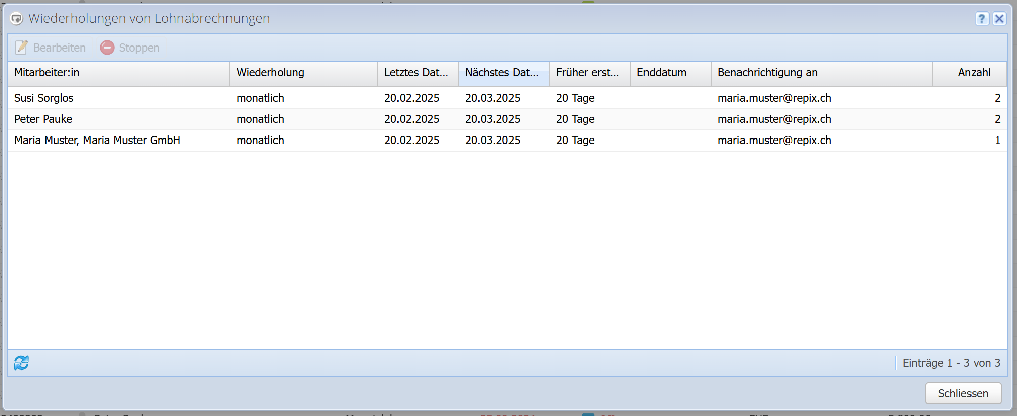 Hier können Sie alle sich wiederholenden Dokumente einsehen und die Wiederholungen bearbeiten oder löschen. Die entsprechende Lohnabrechnung kann hier allerdings nicht bearbeitet werden, nur die Wiederholungs-Attribute.