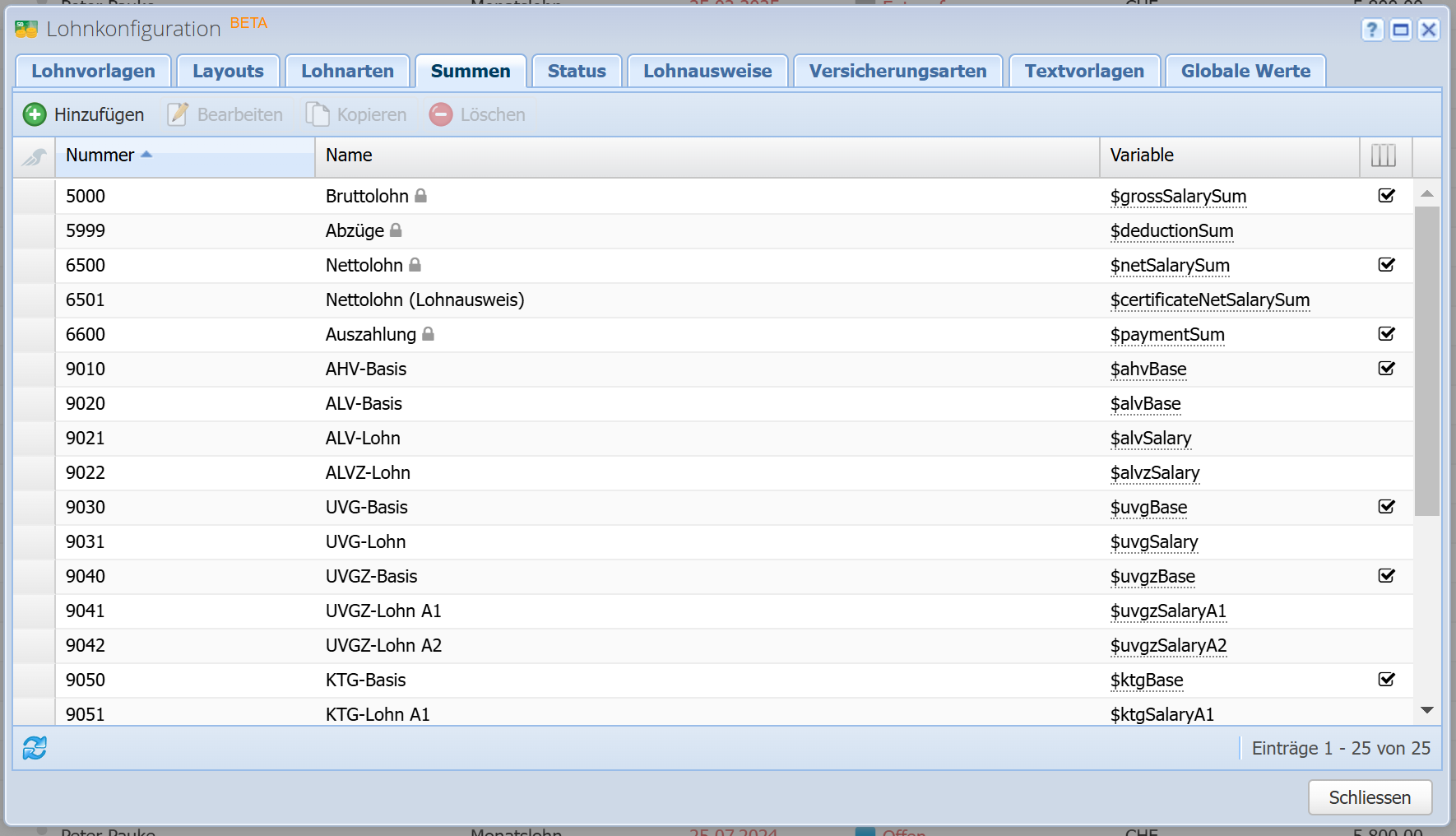 Hier befinden sich Summen und Basen, das sind im Prinzip Variablen die jeweils eine Summe enhalten. Manche dieser Summen werden auf der Lohnabrechnung dargestellt (wie Bruttolohn, Abzüge, Nettolohn, Auszahlung). Alle Summen werden im Bericht Lohnartenrekapitulation dargestellt. Manche Summen gelten als Basen für die Berechnung von bestimmten Lohnarten wie z.B. die AHV-Basis (Summe) für den AHV-Beitrag (Lohnart). Dabei wird die Summe bei dieser Lohnart als Variable ($ahvBase) zur Berechnung des AHV-Beitrags verwendet.