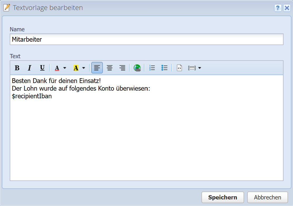 Platzhalter einfügen: Über dieses Menü können Sie diverse Platzhalter (Variablen) in den Text einfügen, wie z. B. den vollständigen Namen des Kunden, den eigenen Namen, die Kunden-Nr., das Datum etc.
