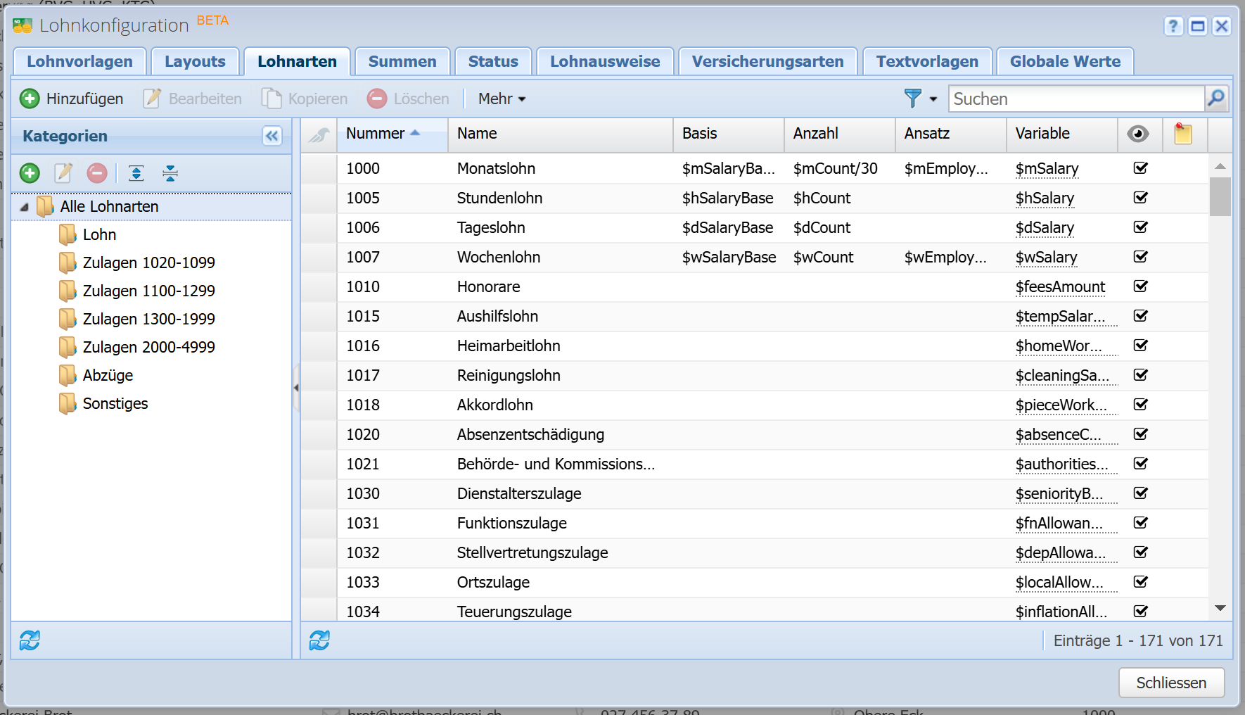 Hier verwalten Sie den Lohnartenstamm, mit mehr als 160 Lohnarten (grösstenteils von Swissdec übernommen). This is where the magic happens!