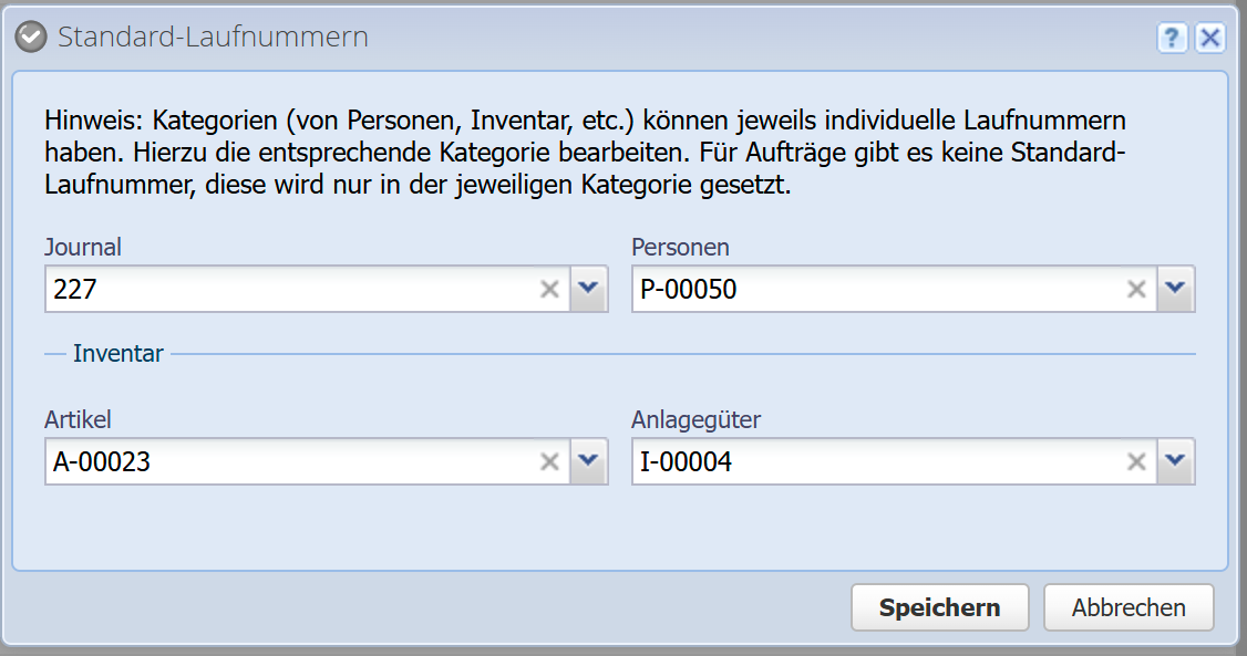 Wenn Sie in einer Artikel-Kategorie jedoch eine Laufnummer gesetzt haben, dann wird diese verwendet und nicht der hier gesetzte Standard. Dasselbe gilt für Personen-Kategorien.