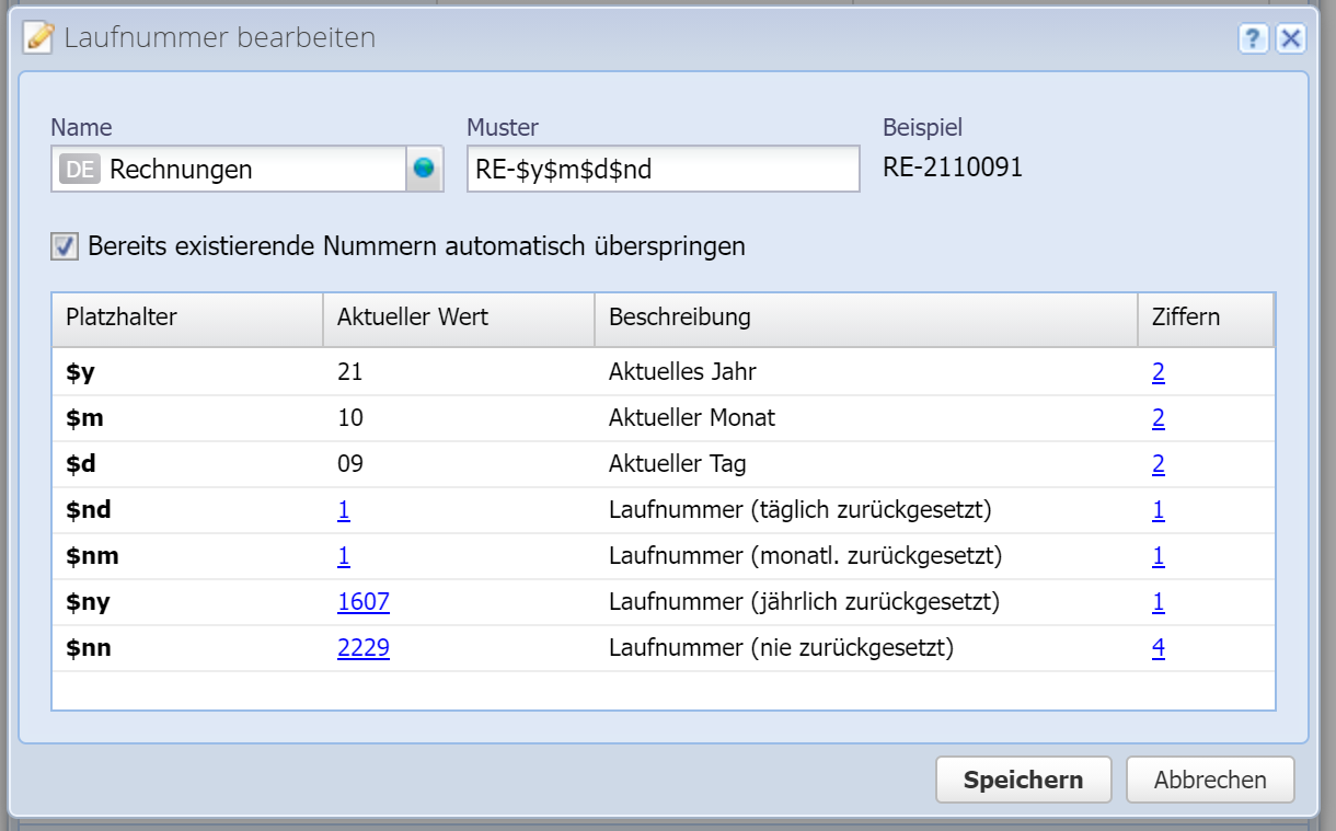 Platzhalter (Variablen) können im Muster verwendet werden, um eine Laufnummer zu generieren. In der Beschreibung steht jeweils, wofür der Platzhalter steht. Also $y für das aktuelle Jahr, $m für den aktuellen Monat, etc.