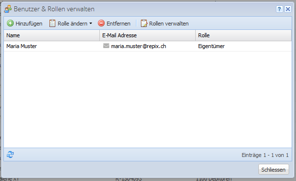 Wenn Sie die Organisation neu erstellt (resp. neu registriert) haben, sind Sie als alleiniger Benutzer und Eigentümer der Organisation eingetragen. Den Eigentümer kann man weder löschen noch seine Rolle ändern. Es kann ausserdem pro Organisation nur ein Eigentümer existieren. Die Gebühren für die Nutzung des Programms werden immer dem Eigentümer verrechnet. Falls Sie das Eigentum auf eine andere Person übertragen möchten, kontaktieren Sie uns hierzu (siehe Support anfragen), denn dies ist momentan im Programm nicht möglich.