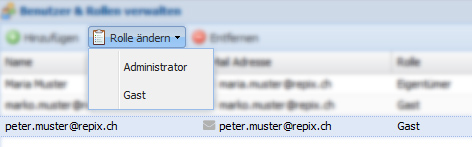 Klicken Sie auf einen oder mehrere Benutzer, um deren Rollen zu ändern (dabei darf der Eigentümer nicht in der Auswahl sein, denn dieser lässt sich nicht ändern). Wählen Sie dann die gewünschte Rolle unter "Rolle ändern" aus.